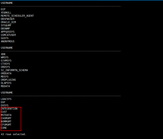 部分用户名:CORE,MSTDATA,BOMMGMT,CFGMGMT,CHGMGMT,CUST,integration