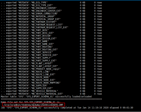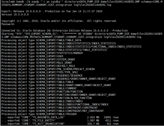 [oracle@t-bomdb ~]$ expdp "'/ as sysdba'" directory=DATA_PUMP_DIR dumpfile=20200104USERS.DMP schemas=CORE,MSTDATA,BOMMGMT,CFGMGMT,CHGMGMT,CUST,integration logfile=20200104USERS.log