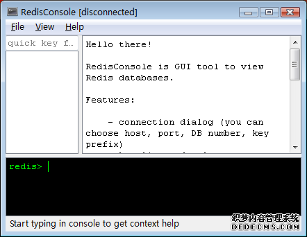 protected virtual void AddCurrentQueuedOperation()Redis工具篇 Redis的客户端redis-cli不是太好用,退格键和箭头都不能正常使用,这个的确影响效率,还是需要找一个合适的工具,我比较喜欢这个:RedisConsole https://github.com/ptrofimov/RedisConsole/downloads 这个工具用来学习是很好用的,但是数据量一旦增大,左侧列表就混乱了,而且一点击就假死;所以建议只在学习阶段使用;