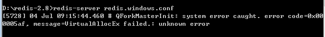 结果就悲剧了,提示:QForkMasterInit: system error caught. error code=0x000005af, message=VirtualAllocEx failed.: unknown error 。原因是内存分配的问题(如果你的电脑够强悍,可能不会出问题)。解决方法有两个,第一:启动的时候使用--maxmemory 命令限制Redis的内存: