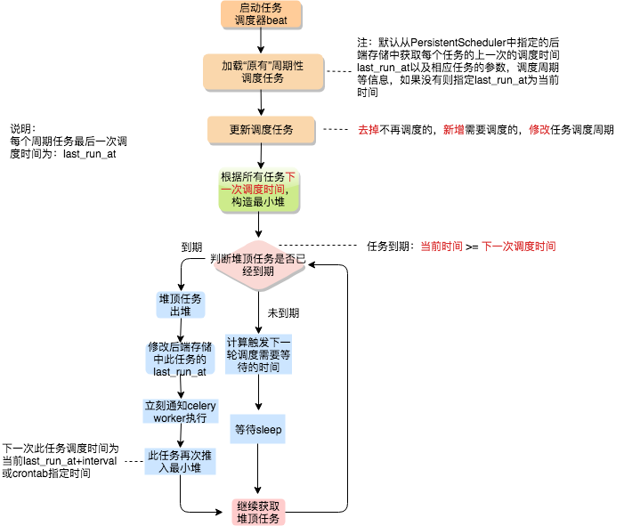 由上图可以了解到,Celery4.x中使用了最小堆的方式来计算下一次需要触发调度的周期性任务(Celery3.x并未使用此数据结构)。同时会在内存和后端存储(数据库/文件)中记录每个任务最后一次的调度时间。但是从原生Beat中也可以看出,只有当重启beat进程时才能对周期性任务进行增删改操作,并无法进行动态修改,并且不支持容错行为。