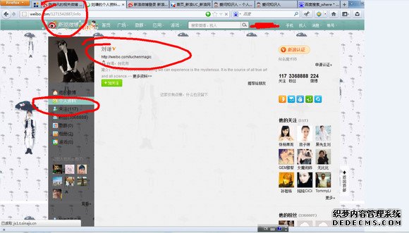 通过修改字段还可以获取其他信息 。 直接举个例子比如我们通过新浪微波查找到刘谦,点击他的个人资料。我们可以再浏览器地址栏处看到刘谦的uid(新浪用户数字id),此处uid为12715428867
