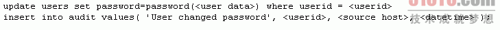 然而,在默认情形下缺乏事务支持也可能会导致安全隐患。举例来说,假设实现前面的系统的公司具有审计每次密码改变的要求, 同时假定使用了如下所示的查询: