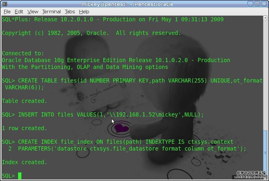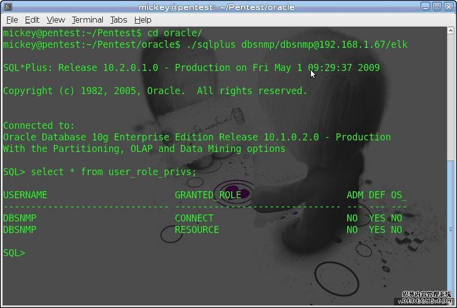 我的渗透环境用的是 ubuntu8.10+metasploit 3.3 dev,oracle 数据库版本为 10.2.0.1.0,服务启动权限为 administrator,数据库账户用的是 dbsnmp 账户的默认权限.