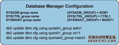 SYS* 权限是在数据库管理器配置中设置的,通过将操作系统或安全性设施中定义的用户组指派给关联的参数进行设置。它必须是最大长度为 8 个字符的组名称,如下所示。