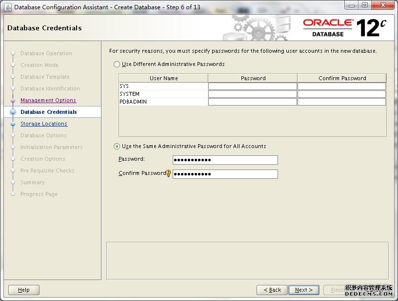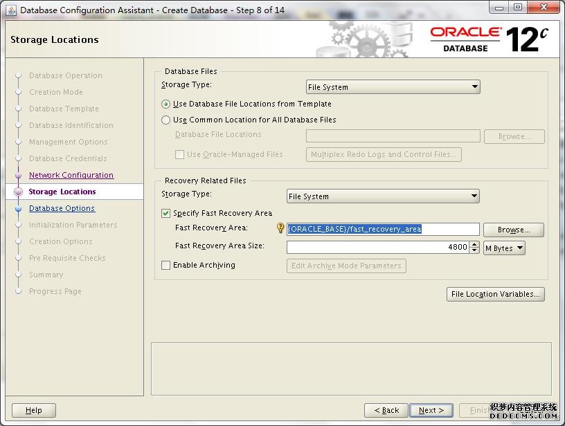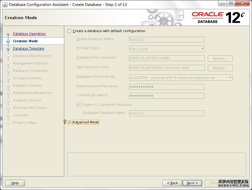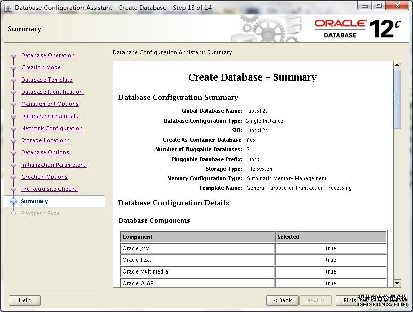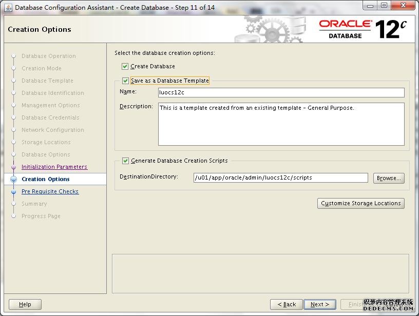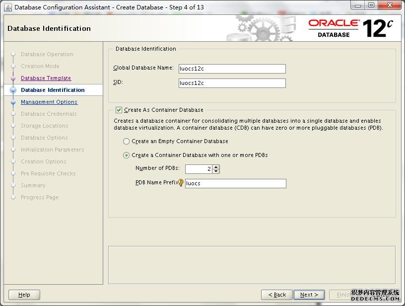 这里稍作解释,我勾选了Create As Container Database,然后选择了Create a Container Database with one or more PDBs,数量为2个,PDB Name为luocs,到时候就以luocs1、luocs2形式出现。当然,我们也可以在后续手动方式创建或者克隆出PDBs