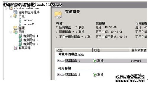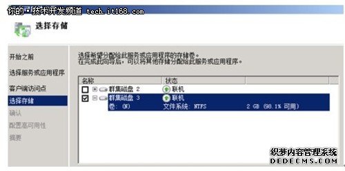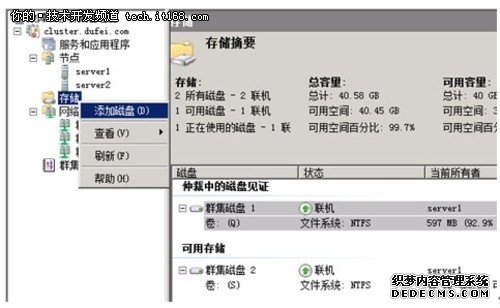 添加磁盘资源:返回到群集管理器,我们需要将新增加的磁盘添加到群集中。方法如下,点击存储---添加磁盘。