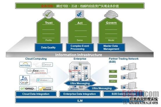Informatica既可以在数据架构层面提供信息传递、B2B数据交换、企业数据集成等一系列的基础架构解决方案,同时也可为行业提供数据质量管理、主数据管理和复杂事件处理等方案,来支撑数据中心实现可信、交互、权威的信息资产管理,达成企业的业务目标,这也是信息中心建设的一个重点。