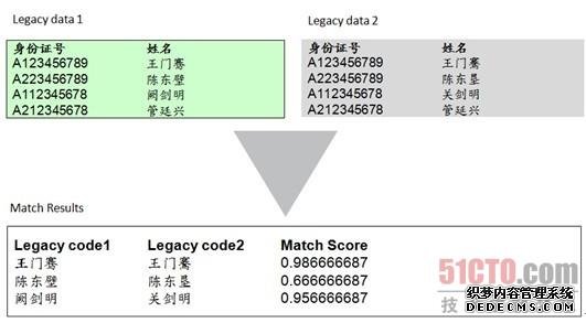 这里重点介绍一下Informatica最具特色的模糊匹配技术。在数据匹配关联中,可以用到不同的匹配关联技术,比如在实现数据的精确快速匹配时,可以先对数据进行预览,查看两个数据的可匹配度是多少,再进行分析来确定这种匹配是否适用于此种数据的匹配过程。如没有精确匹配来保证匹配率,则可以采用模糊比对的方法,比如下图中,在人名比对中,可能因为拼音简、繁体输入问题造成一个人的数据信息不一致,王门骞的“骞”,一个是简体,一个是繁体,这两个字在计算机编码中并不一致,所以他们的名称并不相等,这时就要对他的名字进行模糊匹配打分,通过结果来分辩数据的可信度。比如设定0.8以上的数据为可信,那第两条王门骞就是可信的同一个人,而第二条陈东壁被判定不是同一个人。
