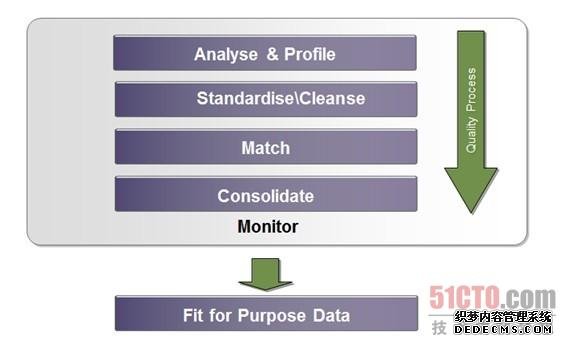 一个完整的数据质量管理,是人、流程和技术的完美配合,才能达到我们数据质量管理的目标。那数据质量处理的流程是怎样的呢?对于数据质量的处理,我们把它分成两大部分,一是面向数据质量的分析过程,二是针对分析结果进行增强的过程。先要识别和量化数据质量,然后定义数据质量和目标,接下来就要交给相关部门设计质量提升的流程,其后就是实现质量提升的流程,把原有低质量数据变成高质量数据,并交付给业务人员使用。同时,在整个环境中,还需要有相关的一些监控和对比来评估是否达成了目标,决定是否需要进行新一轮的数据质量提升。这是一个周而复始、螺旋上升的过程,并不是一蹴而就,一次就可以解决全部问题。