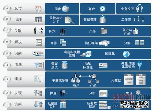 Informatica MDM能够全程支持主数据生命周期的9个步骤,即访问、发现、建模、清理、识别、解决、关联、治理和交付。通过统一的平台管理所有类型的主数据,提供多域主数据的整合,导出可靠、完整的核心业务数据。帮助企业改善业务运营、更快实现业务创新,适应市场变化,并降低总体拥有成本。