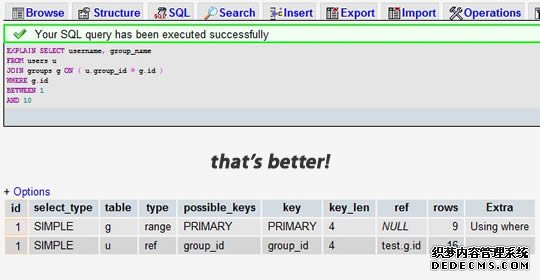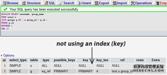 挑一个你的SELECT语句(推荐挑选那个最复杂的,有多表联接的),把关键字EXPLAIN加到前面。你可以使用phpmyadmin来做这个事。然后,你会看到一张表格。下面的这个示例中,我们忘记加上了group_id索引,并且有表联接: