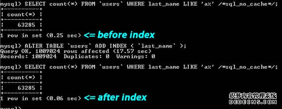 从上图你可以看到那个搜索字串 “last_name LIKE ‘a%’”,一个是建了索引,一个是没有索引,性能差了4倍左右。