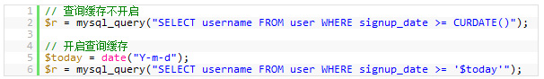 上面两条SQL语句的差别就是 CURDATE() ,MySQL的查询缓存对这个函数不起作用。所以,像 NOW() 和 RAND() 或是其它的诸如此类的SQL函数都不会开启查询缓存,因为这些函数的返回是会不定的易变的。所以,你所需要的就是用一个变量来代替MySQL的函数,从而开启缓存。
