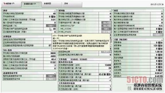 从上图可以看出,排序溢出很大 ( 到了 100%),说明 sortheap 需要调整,缓冲池 IBMDEFAULTBP 的命中率很低(只有 69.5%),说明缓冲池太小,需要调大。所以在分析系统性能问题是使用 DB2 Performance Expert 是一个不错的选择。