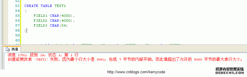 最小行大小8061 = 4000 + 4000 + 54 + 7(内部开销)。下面我们改变下上面脚本的数据类型,如下所示,看看在SQL SERVER 2005下的情况