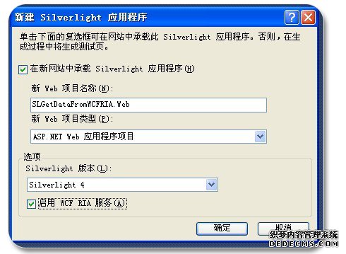 第二步:点击确定之后,在弹出的“新建Silverlight应用程序”窗口中,选中“启用 WCF RIA 服务”复选框然后确定。