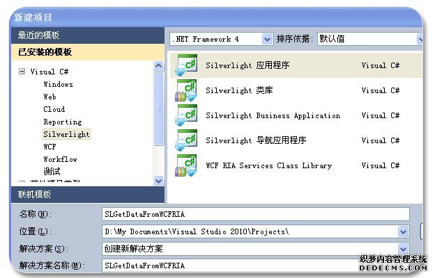 第一步:首先我们打开VS2010,新建一个Silverlight应用程序项目SLGetDataFromWCFRIA。