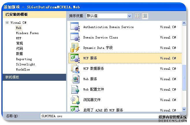 第三步:在创建好的项目中,鼠标右键点击“SLGetDataFromWCFRIA.Web”项目,然后“添加”-->“新建项”-->“WCF服务”,命名为SLWCFRIA.svc。