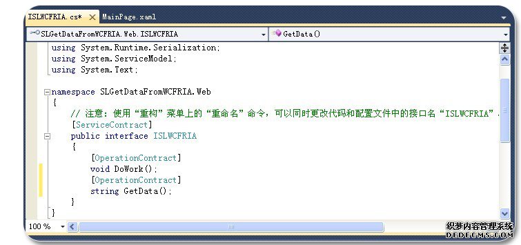 第四步:在上一步生成的ISLWCFRIA.cs文件中,我们可以定义相关的通信的契约,在本实例中我们定义一个string GetData()契约。