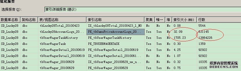 但是上面那个PK_tbGamePriceAccountLogs_XX这个有32多M就要跟据自己的实际情况进行优化。