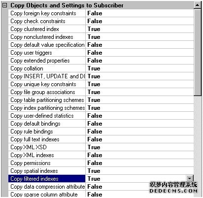 在Object Explorer打开连接的实例中的Replication复制)文件夹à右键新建发布à在向导中选择Publication Database为db_encryption_testà选择事务复制à在Article中选择lovesql表->在右手边的Article Properties设置表的发布属性à配置如下: