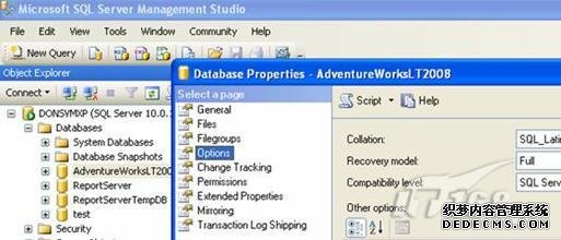 要查看一个数据库恢复模式设置,打开SQL Server服务器管理,右键点击一个数据库,然后选择属性。一旦属性对话框中打开后,从左边的菜单选择“选项”。