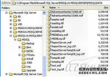 每一个SQL Server数据库在硬盘上包含至少两个物理文件,一个MDF文件和一个LDF文件。MDF文件包含所有被存储的实际数据。LDF文件或日志文件,包含了每一个数据变化的纪录。记录每个数据变化使撤销操作和“时间点”备份成为可能。一个时间点的备份使我们能够恢复我们希望的任何时间点的数据库,昨天,两个小时前,两分钟前。默认情况下,MDF和LDF文件位于硬盘上SQL Server下的Server\Version\MSSQL\Data 目录下。