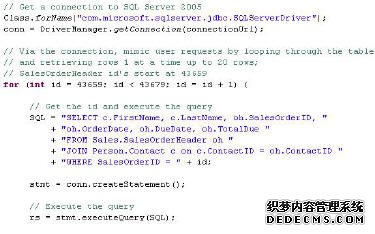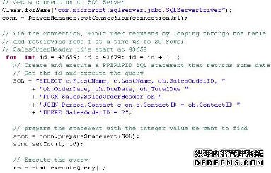 下面的Java代码片断提出一系列非参数特设查询到AdventureWorks数据库中,以此来获得用户销售订单数据。它通过循环,从AdventureWorks SalesOrderHeader表中前20张订单中获得信息。