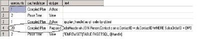 select qs.usecounts, cacheobjtype, objtype, qt.text from sys.dm_exec_cached_plans qs cross apply sys.dm_exec_sql_text(qs.plan_handle) as qt order by qt.text go |