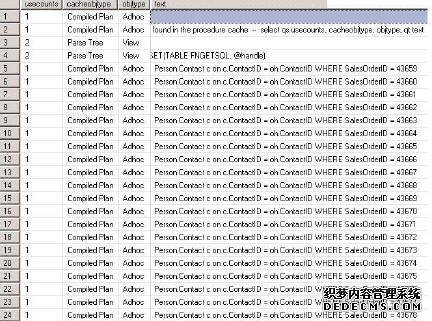 让我们用SQL Server 2005 DMVs来检验计划缓存中特设查询的效果。