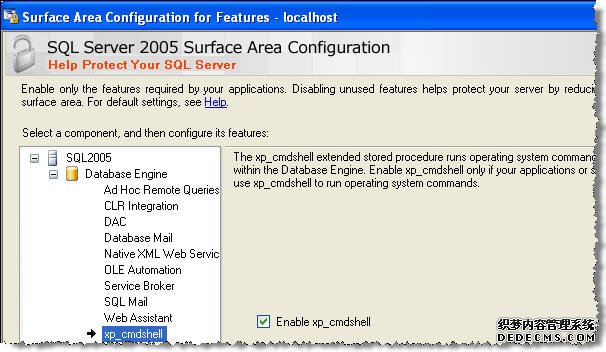 选择功能中的Surface Area Configuration并检查Enable xp_cmdshell检验栏。