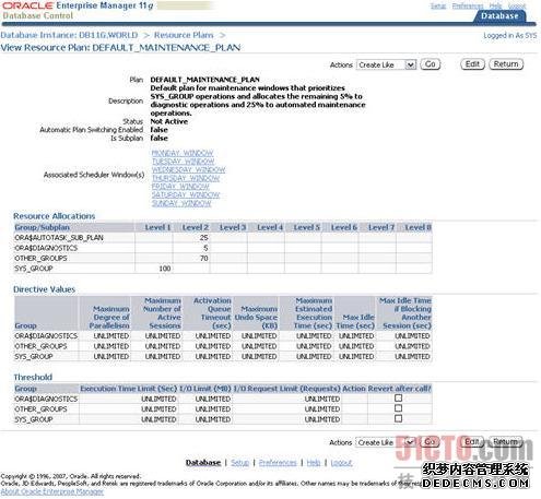 “编辑窗口”屏幕包括了“查看资源计划”和“创建资源计划”按钮。点击它们就进入“资源管理器维护”屏幕,默认情况下,所有的维护窗口都被指派给DEFAULT_MAINTENANCE_PLAN资源计划。
