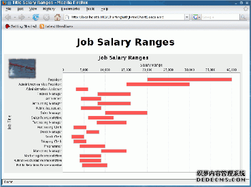 我们要绘制成图表的数据表示各个职位的工资范围。具有 IntervalBarRenderer 的 JFreeChart 条形图可以很好地反映这组数据。对传入的 XML 数据进行迭代,用最低工资、最高工资和职位填写三个数组。在生成的图表上调用 createBufferedImage 可以提供一个 BufferedImage。getLogo 调用返回包含在另一个 BufferedImage 中的我们的公司徽标。使用 Java 的二维图形功能,可以将公司徽标绘制在图表图像上,与原来的图表图像有一些小的偏移。
