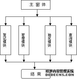 抽奖系统主要由来宾登记、奖票管理、幸运抽奖、获奖查询四个基本模块构成,登记模块登记参加抽奖人员,奖票管理模块初始化参加抽奖人员名单,抽奖模块实现抽奖功能,获奖查询模块查询获奖结果。其中,抽奖模块中可以实现奖励等级、总抽奖数、每一次抽奖数的控制。系统架构框图如图1。