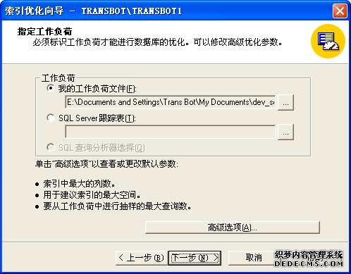如图C所示,你可使用文件或数据库跟踪来初始化向导。第3个选项在图C中呈现灰色不可用状态)只有在你从查询分析器中运行ITW时才可使用。显然,查询分析器允许你定位一个较小的问题集,而不必面对一个包容面更广的事件探查器跟踪。