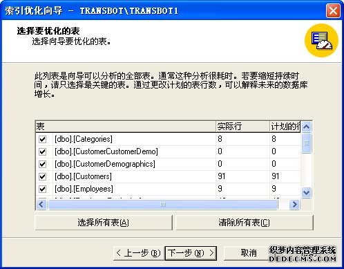 图E显示了你如何选择想让向导检查的表。显然,你的跟踪需要针对这些表捕获最有代表性的活动,向导才能最好地发挥作用。同样地,选择的表越多,优化时间越长。