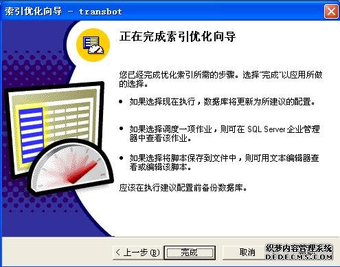 在此过程中,SQL Server的性能会受到严重影响,所以在操纵这些选项时,要特别注意你的工作环境。例如,如果你有一个生产型OLTP数据库,但日志记录到一个OLAP服务器,那么应该针对OLAP数据库来运行向导,再将建议的更改应用于这两个系统。