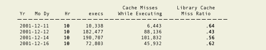 Listing A包含有使用这些性能信息的例子。这个脚本会生成一个在一段时间内库缓冲区失败率的连续总计,还会引用stats$librarycache表格。