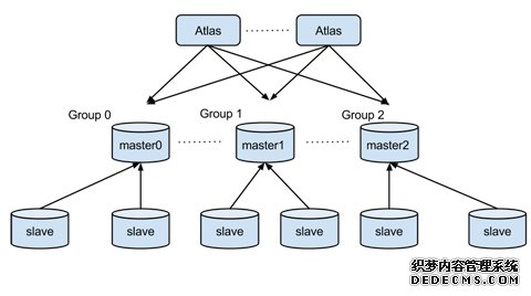 在Atlas中, 将一个组看做是数据存储的单位, 一个组由一台master, 零台或者多台slave组成(mysql主从同步需要由用户自己配置). 每个组之间的数据独立, 没有关系, 表的数据的各个部分存储在各个组中.
