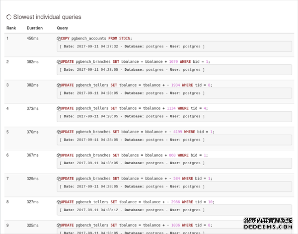 pgBadger是一个完美的分析工具,旨在提高数据库的性能,因为它具有丰富的统计结果。