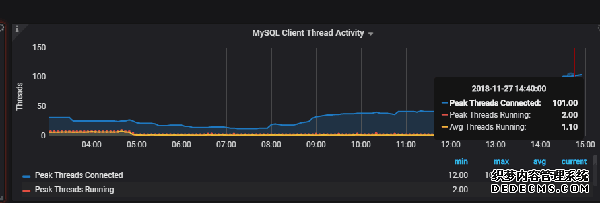 登录 Grafana 监控面板,数据库连接在哪个时间段曾有幅度的增长。