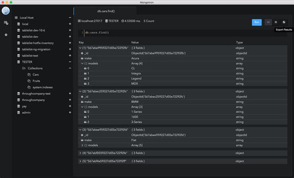 MongoJS查询分析器Javascript编辑器允许执行JavaScript命令并支持自动完成和语法突出显示。结果可以在树层次结构,网格结果和文本中看到。