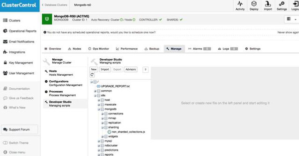 ClusterControl是另一个MongoDB工具,具有管理数据库基础结构的GUI。它还有两个版本 - 社区和企业版。不用说,ClusterControl社区版可以免费使用,而企业则是付费的。它不仅限于MongoDB,还支持MySQL,MySQL复制,MySQL NDB集群,Galera集群,MariaDB,PostgreSQL,TimescaleDB,Docker和ProxySQL。