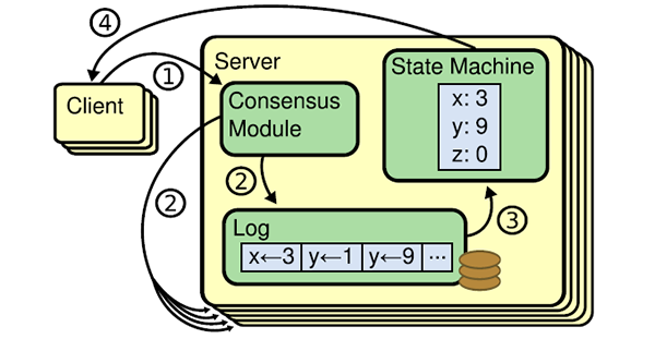 当leader被选举出来,他就作为服务器处理客户端请求。客户端的每一个请求都被看成复制状态机所需要执行的指令。领导者把这条指令作为一条新的日志条目附加到日志中去,然后并行的发起附加条目 RPCs 给其他的服务器,让他们复制这条日志条目。当这条日志条目被安全的复制,领导者会应用这条日志条目到它的状态机中然后把执行的结果返回给客户端。如果跟随者崩溃或者网络丢包,领导者会不断的重复尝试附加日志条目 RPCs (尽管已经回复了客户端)直到所有的跟随者都最终存储了所有的日志条目。下图为复制状态机模型。