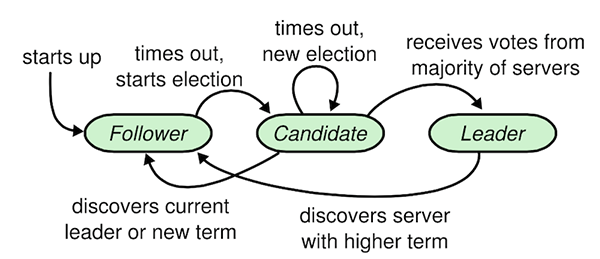 Raft 算法把时间分割成任意长度的任期(term),每一段任期从一次选举开始,一个或者多个候选者尝试成为领导者。如果一个候选者赢得选举,然后他就在这个的任期内充当领导者。要开始一次选举过程,跟随者先要增加自己的当前任期号并且转换到候选者状态,然后他会并行的向集群中的其他服务器节点发送请求投票的 RPCs 来给自己投票,候选者会继续保持着当前状态直到以下三件事情之一发生:(a) 他赢得了这次的选举,(b) 其他服务器成为领导者,(c) 没有任何一个候选者赢得选举。当一个候选者获得了集群大多数节点针对同一个任期号的选票,那么他就赢得了选举并成为领导者。然后他会向其他的服务器发送心跳消息来建立自己的权威并且阻止新的领导人的产生。下图为三种角色的转换状态机。