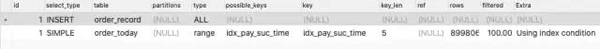 由于查询条件会导致order_today全表扫描,什么能避免全表扫描呢,很简单嘛,给pay_success_time字段添加一个idx_pay_suc_time索引就可以了,由于走索引查询,就不会出现扫描全表的情况而锁表了,只会锁定符合条件的记录。