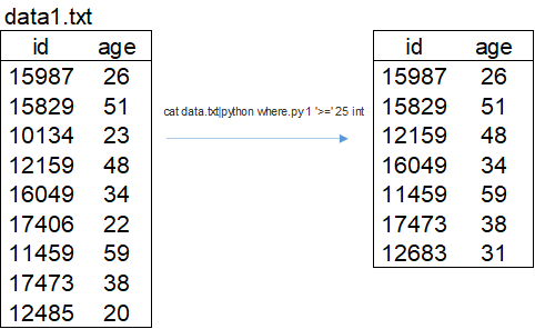 - cat data.txt|python where.py 1 '>=' 25 int